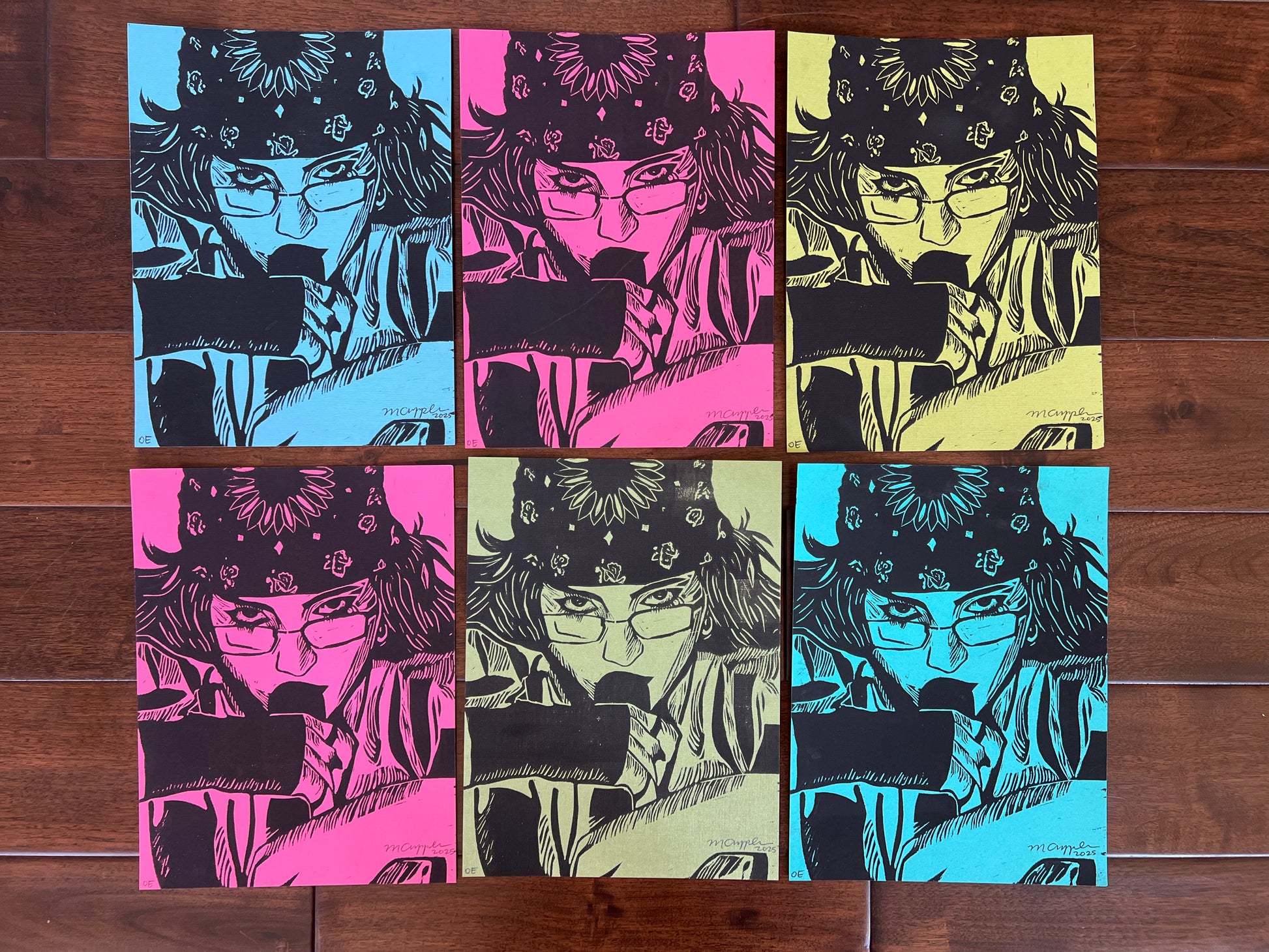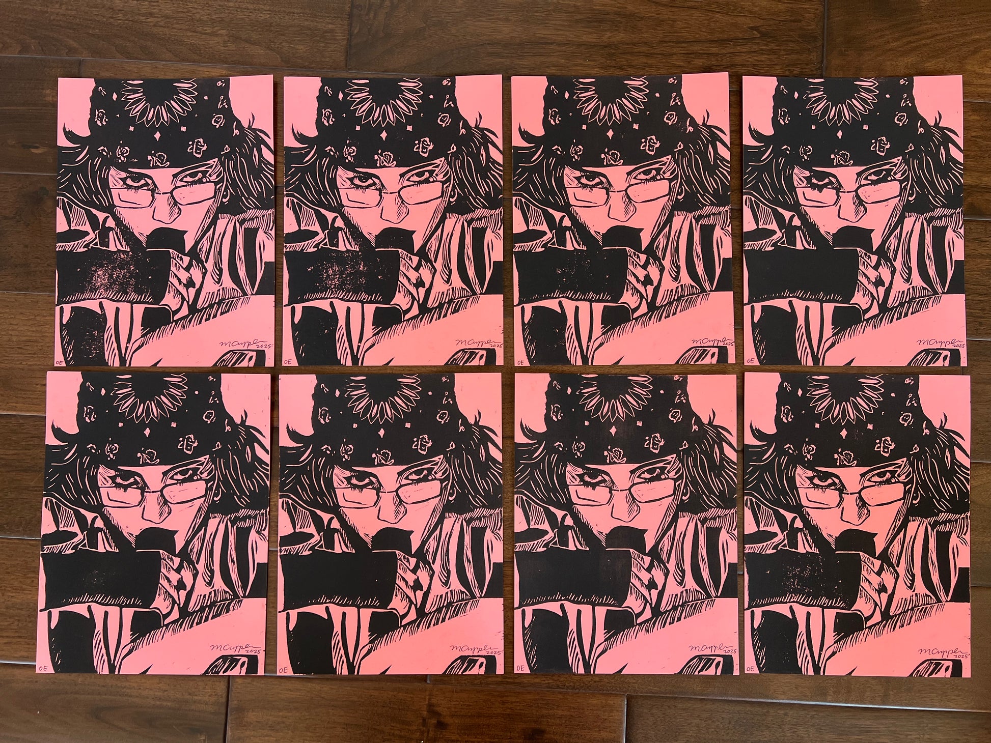 These are hand printed, linoleum block prints. Each are signed and editioned on the front, as well as signed, dated, and titled on the back. Each print will come unframed.