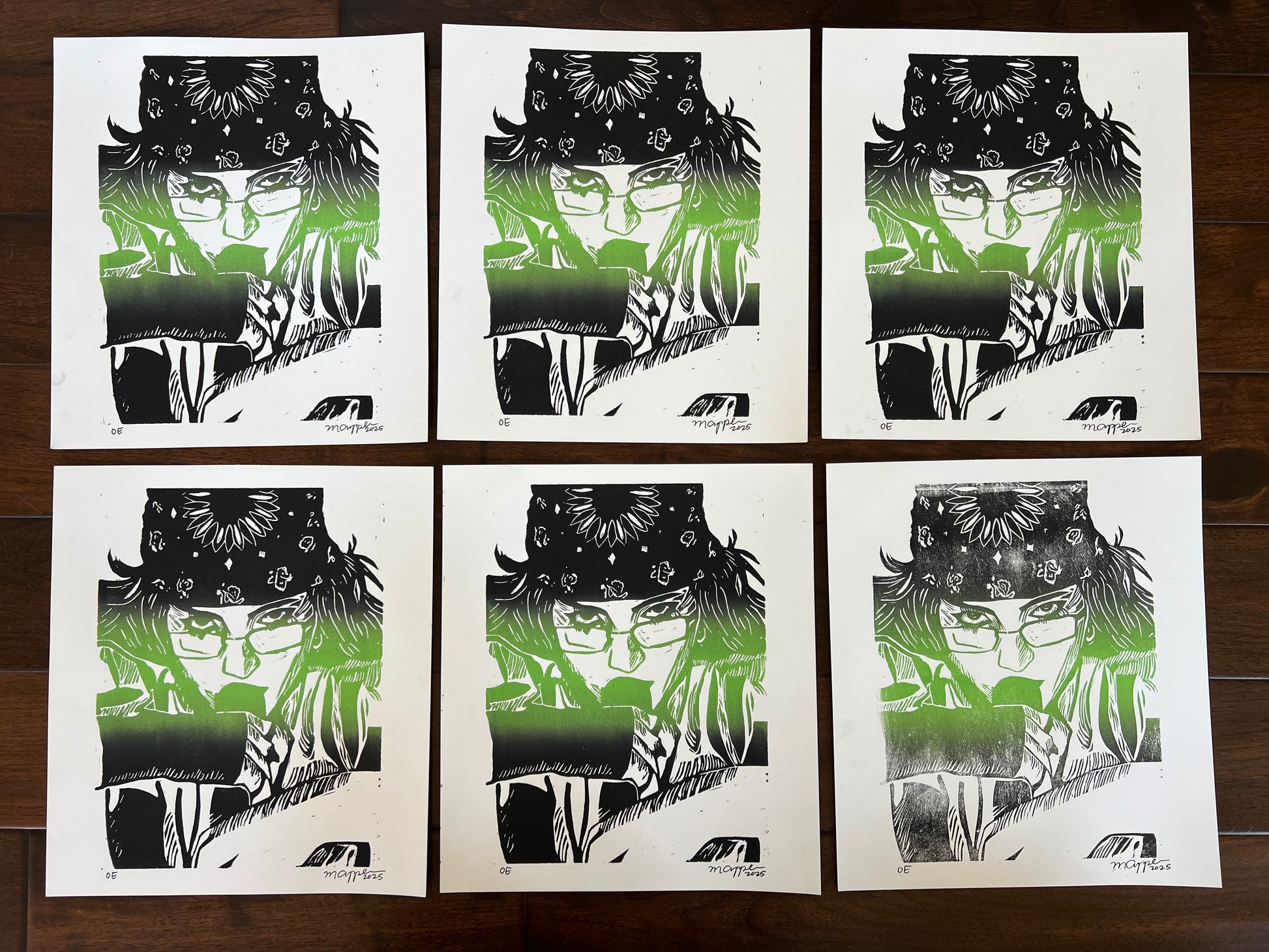 These are hand printed, linoleum block prints. Each are signed and editioned on the front, as well as signed, dated, and titled on the back. Each print will come unframed. This print will be rolled when shipped.